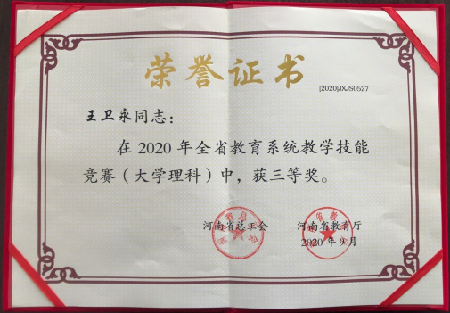 河南省总工会、河南省教育厅于2020年6月至9月在全省教育系统开展了高等院校思政、文科、理科、工科教学技能大赛,经过各级总工会、教学行政部门,高等院校工会、行政及有关单位的精心组织、严密实施,并由河南省教育系统教学技能竞赛领导小组组织的评审委员会评比审定及现场决赛,我校赵杰文老师荣获2020年全省教育系统教学技能竞赛大学工科组二等奖、王卫永老师荣获大学理科组三等奖。